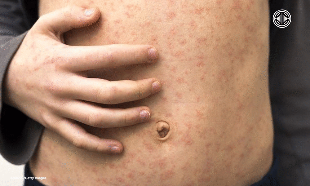 Symptoms typically appear around 10 days after exposure, although the incubation period can extend up to 18 days. Early signs include fever, fatigue, cough, runny nose, and red, watery eyes. A distinctive red, non-itchy rash usually emerges three to four days later, beginning on the face and spreading across the body.